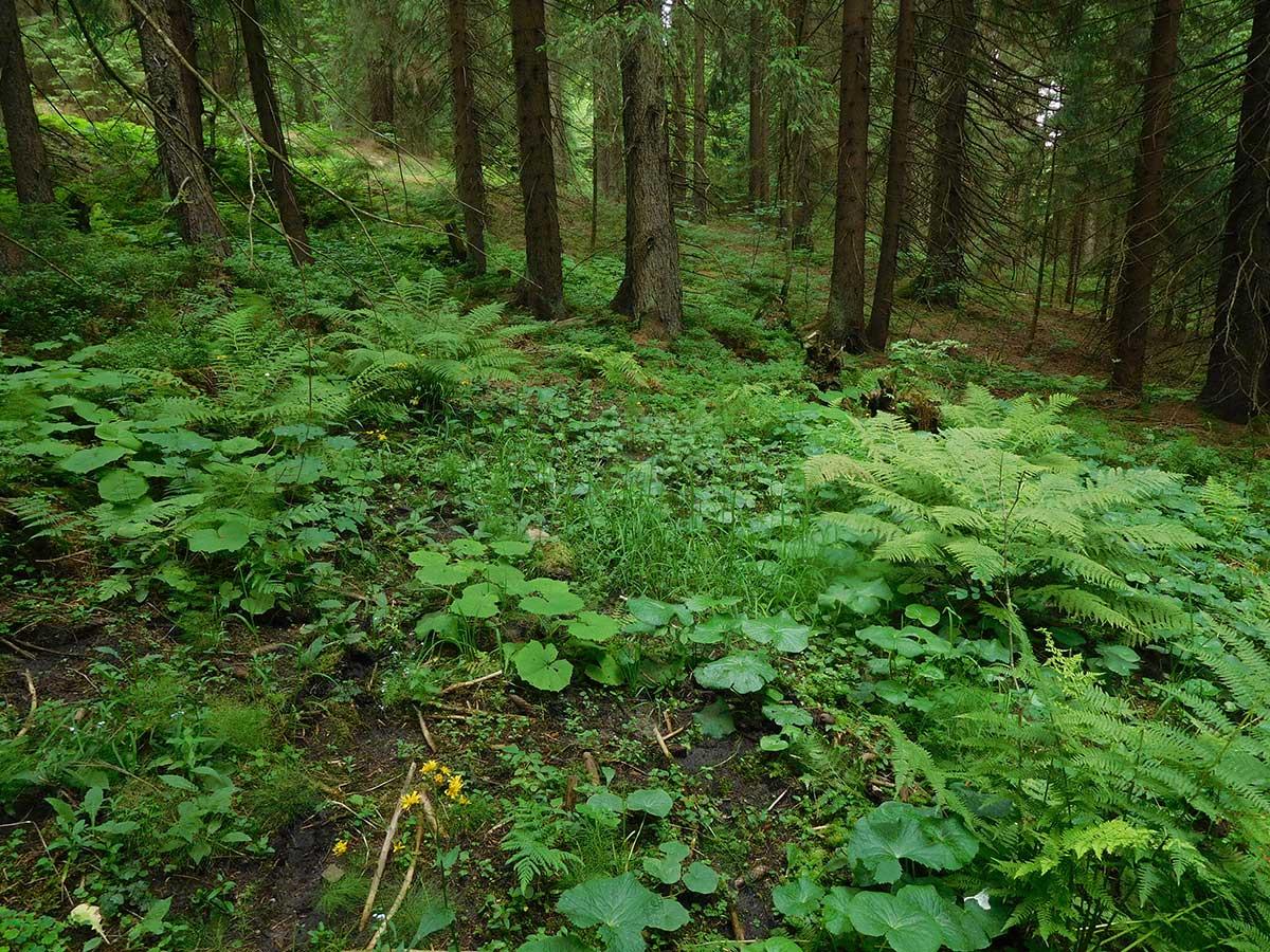 Vyskytují se na dnech údolí, na místě pramenišť či mírně ukloněných svazích zamokřených vodou. Kromě smrku se může občas vyskytnout i jiný druh dřevin, např. olše lepkavá. V bylinném patře bývá hojná borůvka, třtina chloupkatá, různé druhy ostřic a sítin. Z dalších druhů rostlin můžeme vidět různé druhy kapraďorostů – žebrovici různolistou, papratku samičí, kapraď osténkatou. Dále se zde vyskytuje podbělice alpská, ptačinec hajní, dřípatka horská, bika lesní, přeslička lesní či sedmikvítek evropský a plavuň pučivá. V silně vyvinutém druhově pestrém mechovém patře jsou nápadné polštáře rašeliníků. Tento typ lesa je typicky vyvinut nad silničkou kolem pramene Řezné.
