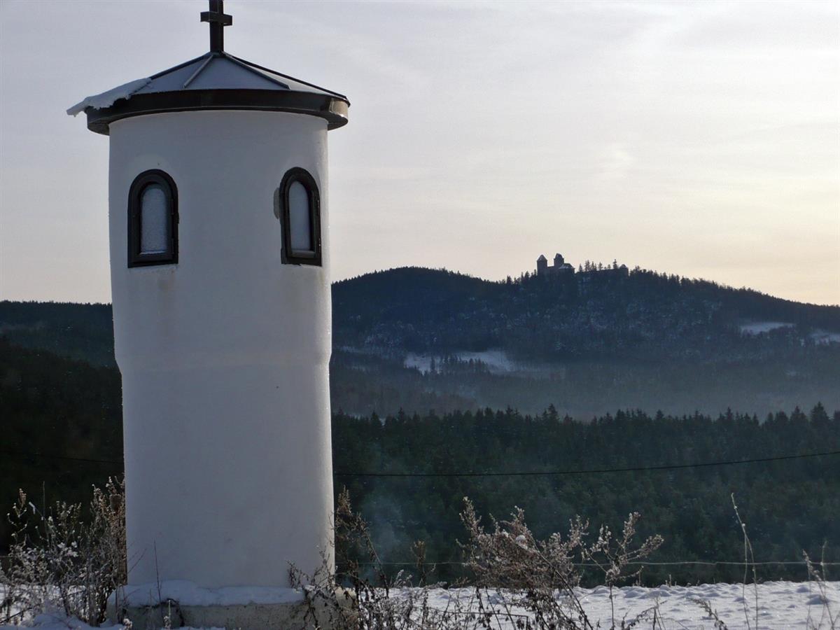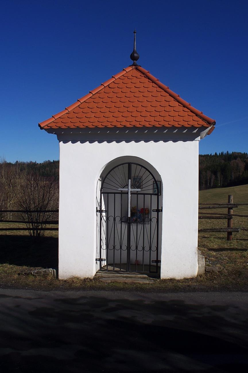 Boží muka atypického kruhového půdorysu ze 2. poloviny 18. století, situovaná v malebné poloze při cestě na Platoř, s výhledem na hrad Kašperk.