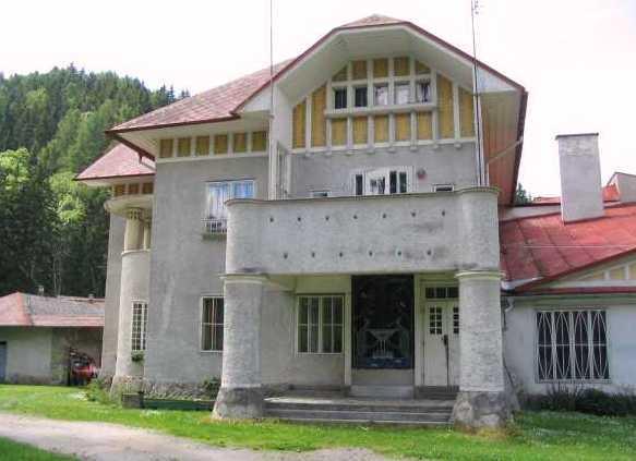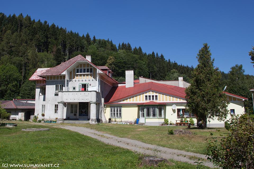 Secesní vila bývalých majitelů sklárny z roku 1903. U vchodu se dochovala barevná skleněná mozaika zobrazující fontánu. Sklárna byla založena v roce 1836 v místě mlýna klatovských benediktinů. Původně vyráběla skleněné perle a tabulové sklo, později také křišťálové a secesní. V letech 1878–1908 patřila k nejvýznamnějším v Rakousko-Uhersku a v té době získala řadu ocenění na světových výstavách. Postupem času význam sklárny klesal, v roce 1947 byla zrušena a budovy v průběhu dalších let zbourány. Výrobky klášterskomlýnských sklářů jsou vystaveny v muzeu v Kašperských Horách.