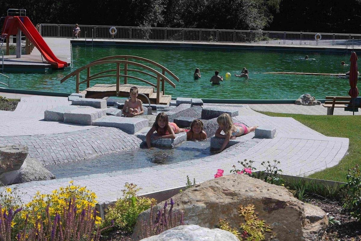 Pro sportovně zaměřené návštěvníky je k dispozici 25 m dlouhý plavecký bazén. Neplavci si užijí zábavu z koupání v samostatném bazénu se skluzavkou. Velkoryse zařízený prostor pro malé děti, kterým protéká potůček, vybízí ke hře s vodními koly, hrázemi a hracími stoly. Areál koupaliště doplňují modřínové lávky.