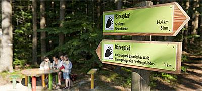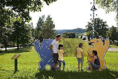 Medvědí stezka, zábavná výletní trasa pro malé i velké, spojuje dvě města medvědů v Národním parku Bavorský les - Grafenau a Neuschönau.